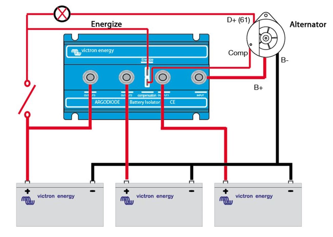 Tα μοντέλα Argodiode AC έχουν μία επιπλέον έξοδο για την εργοποίηση του εναλλάκτη (energize output). Αυτό χρησιμεύει όταν ο εναλλάκτης χρειάζεται επιστροφή τάσης/σήμα ενεργοποίησης για να ξεκινήσει τη φόρτιση.