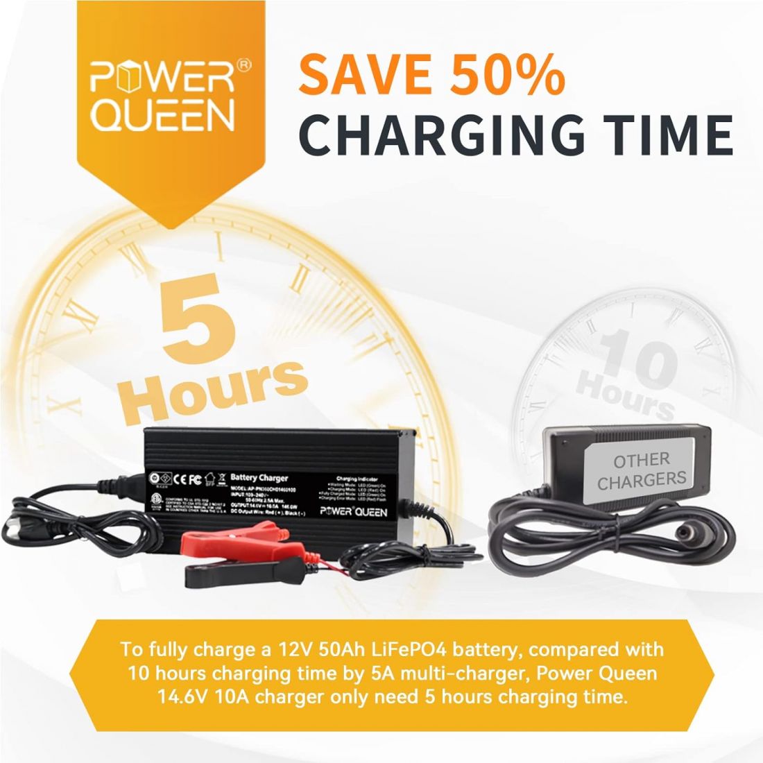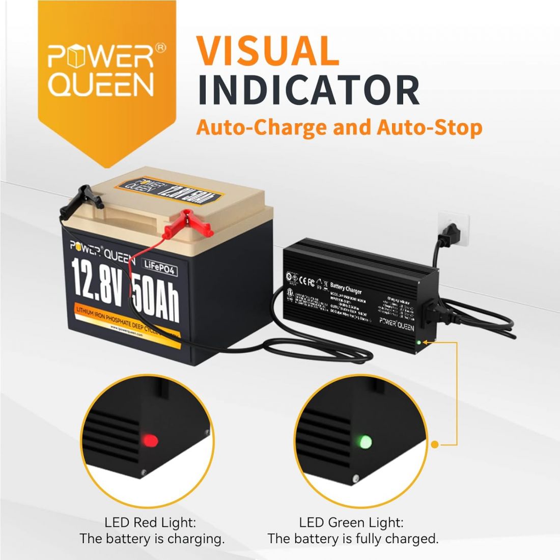 Ο φορτιστής μπαταρίας Power Queen 14.6V 10A LiFePO4 – Heavy Duty είναι ειδικά σχεδιασμένος για μπαταρίες LiFePO4 και εφαρμόζει αλγόριθμο φόρτισης CC/CV τριών σταδίων για ασφαλή και αποδοτική φόρτιση. Διαθέτει λειτουργία φόρτισης 0V για ενεργοποίηση του BMS και ενδείξεις LED καθώς και ψηφιακή οθόνη για άμεση παρακολούθηση της κατάστασης φόρτισης.